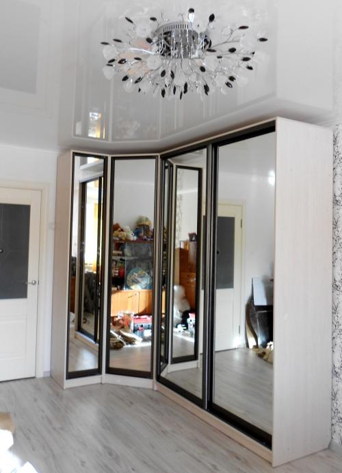 Удобный угловой набор шкафов с фасадами- купе и распашными фасадами. В центре конструкции угловой пятиугольный шкаф. Слева от него не глубокий шкаф с распашными полками. Справа- шкаф- купе.