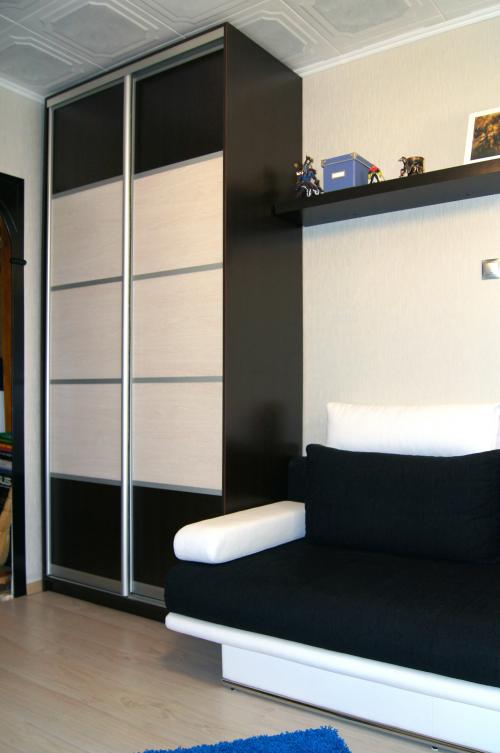 Стильный шкаф- купе с двумя комбинированными фасадами и открытой полочкой в комнату юноши. Наполнение: полки для белья, штанга для одежды. В фасадах в центре вставки светлого лдсп.