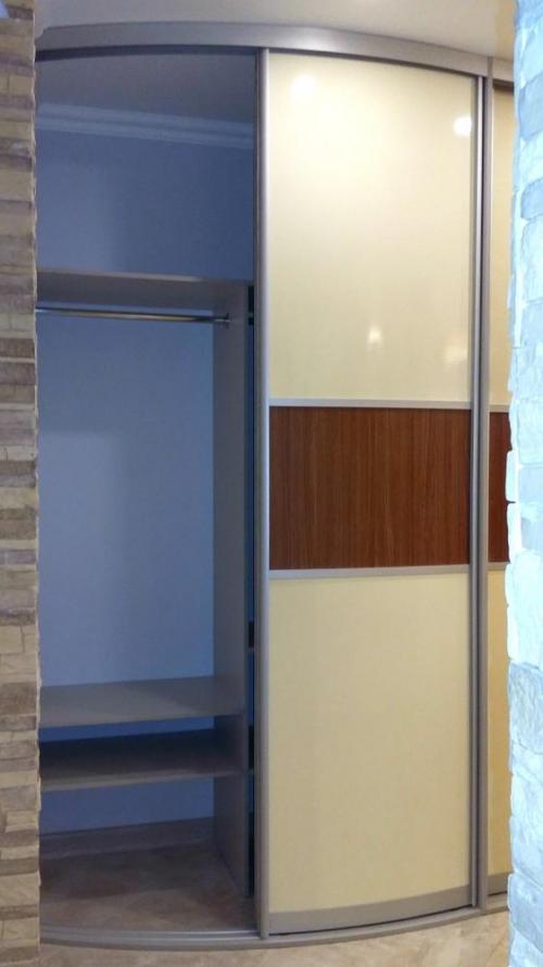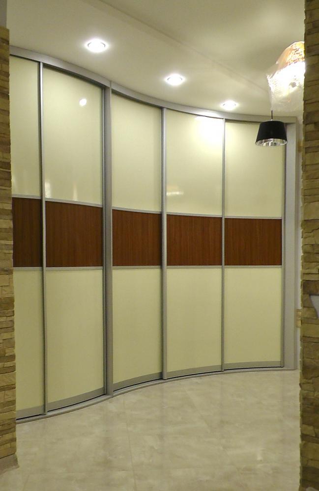 Шикарный встроенный радиусный шкаф- купе для большой прихожей коттеджа. Плавный переход выгнутых фасадов в вогнутые создает неповторимое ощущение роскошности. Функционально шкаф делится на, собственно шкаф с полками и штангами для одежды (два выгнутых фасада слева) и хоз. блок (три вогнутых фасада справа). Фасады хоз. блока закрывают от глаз технический участок прихожей с водонагревателем и коммуникациями. Минус и "головную боль" интерьера мы преобразовали в плюс.