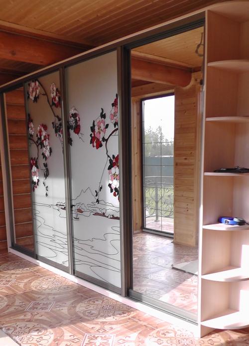 Фасады: Алюминиевый профиль БРОНЗА, зеркало СЕРЕБРО, витраж контурный на зеркале СЕРЕБРО САТИН.