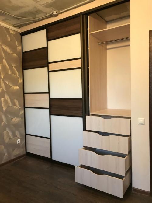 Красивый встроенный шкаф- купе в спальню. Штанги для короткой и длинной одежды, полки, выдвижные ящики помогут хозяйке разложить все вещи "по полочкам". Для крепления натяжного потолка над верхней направляющей установлен короб.