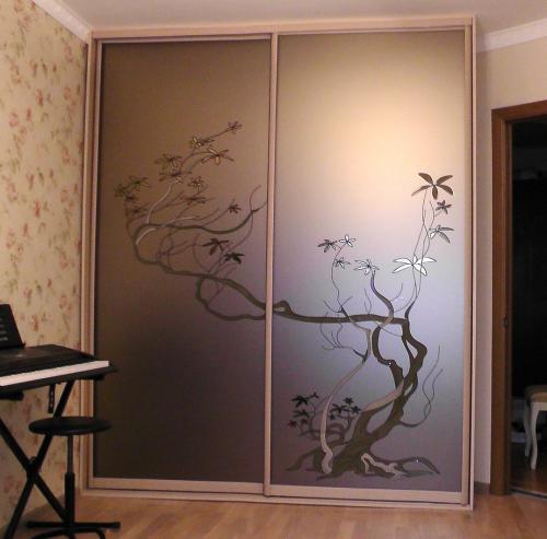 Стильный вместительный двух дверный встроенный шкаф- купе с витражом на матовом зеркале в комнату девочки. Задняя стена "переламывается" в диагональ ближе к правому боку шкафа. Клиенты выбрали не яркий рисунок витража на матовом зеркале.