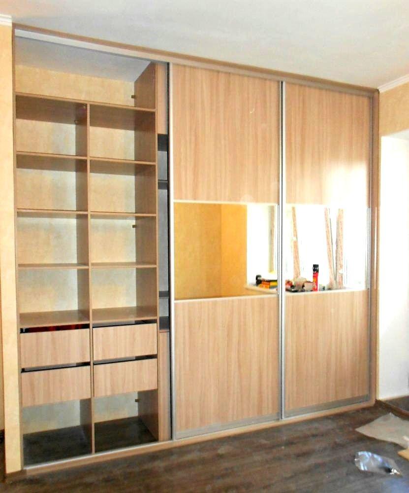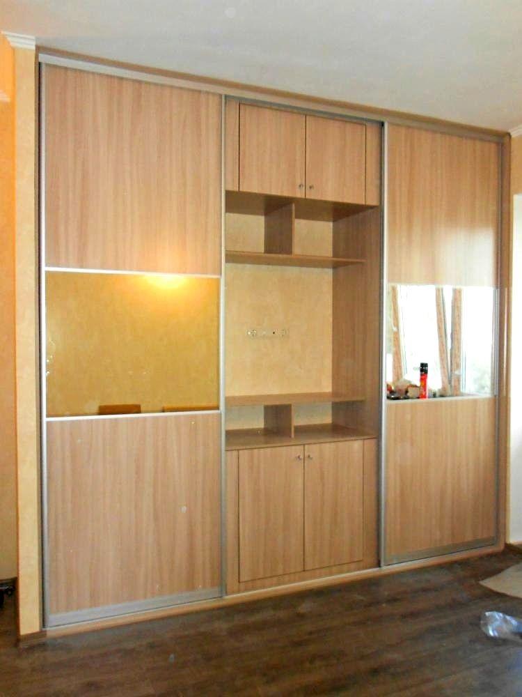 Удобный и многофункциональный шкаф- купе с ТВ зоной в небольшую гостиную. Центральная часть открытая с тумбой, антресолью и открытыми полками для аппаратуры и дисков.
