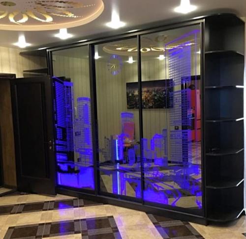 Фасады: Алюминиевый профиль БРОНЗА ,зеркало Графит с пескоструйным рисунком по амальгаме.