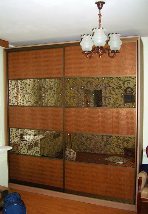 Фасады-купе: Алюминиевый профиль ШАМПАНЬ с делителями, зеркало БРОНЗА с пескоструйным рисунком и стразами Сваровски, искусственная кожа SIBU.