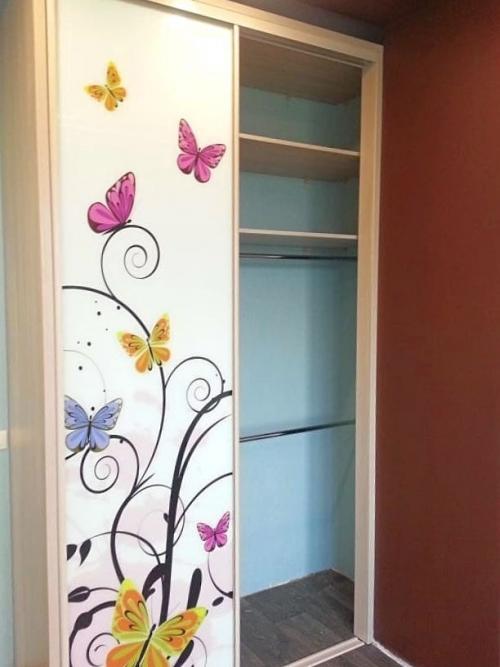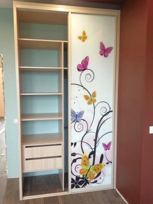 Светлый красавец в комнату девочки с фото фасадом в дверях. Шкаф полу встроенный. Имеет крышу и левую боковину. В фасадах стекло с фотопленкой.