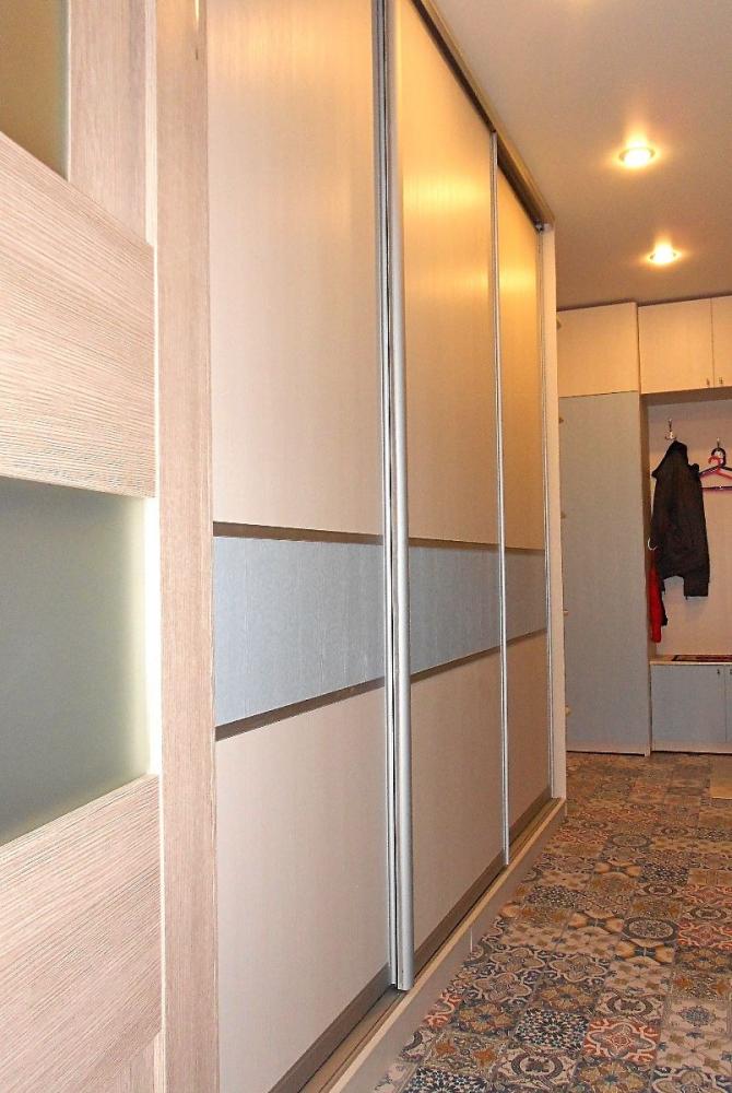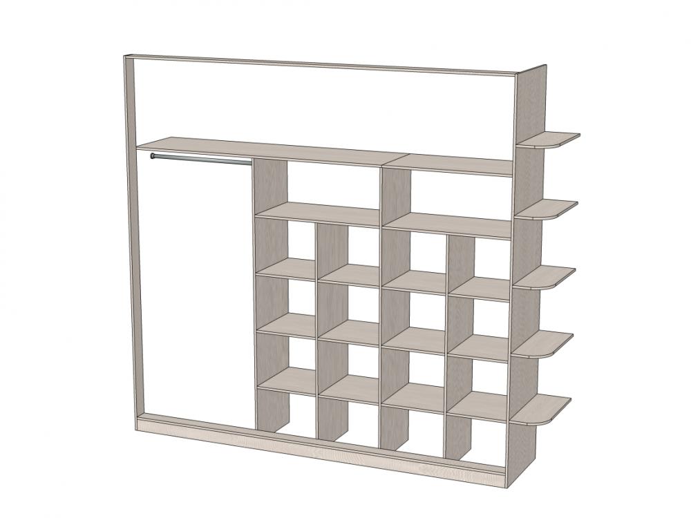 Большой вместительный шкаф- купе. две трети шкафа заняты полками, одна треть штангой для одежды. Шкаф имеет открытые радиусные полки. Эти полки сглаживают острый угол шкафа и дают возможность украсить помещение красивыми безделушками.