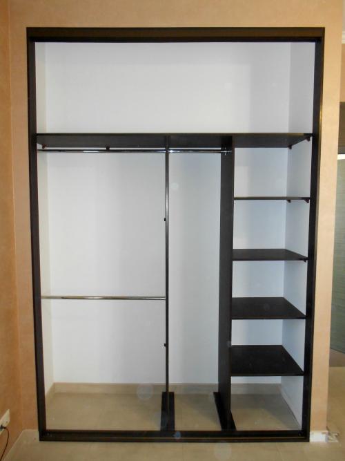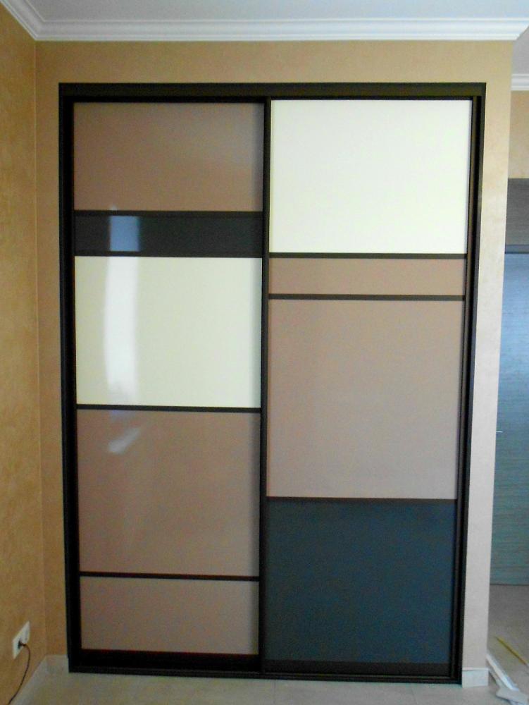 Фасады: Алюминиевый профиль БРОНЗА с делителями, глянцевая пленка ПВХ трех цветов на МДФ основе.