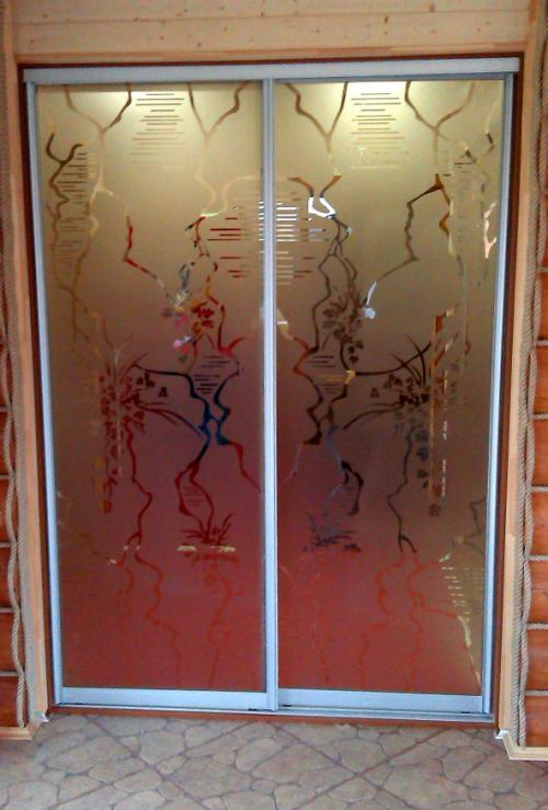 Межкомнатные встроенные фасады-купе с тонированным стеклом БРОНЗА и пескоструйным рисунком. Рейки обвязки по периметру.