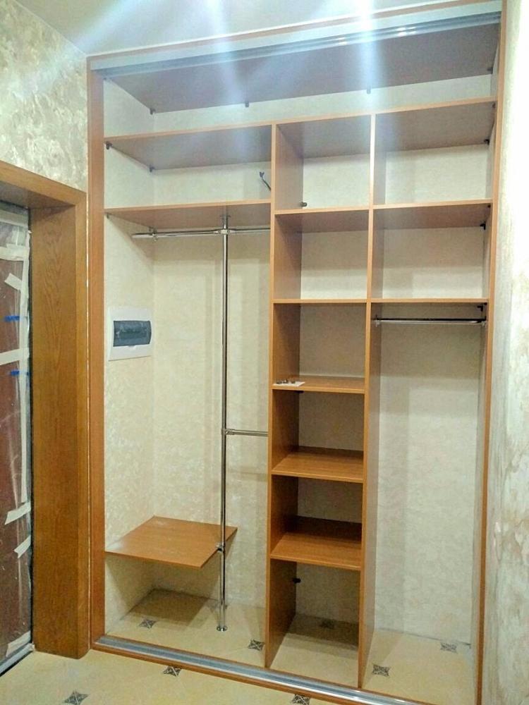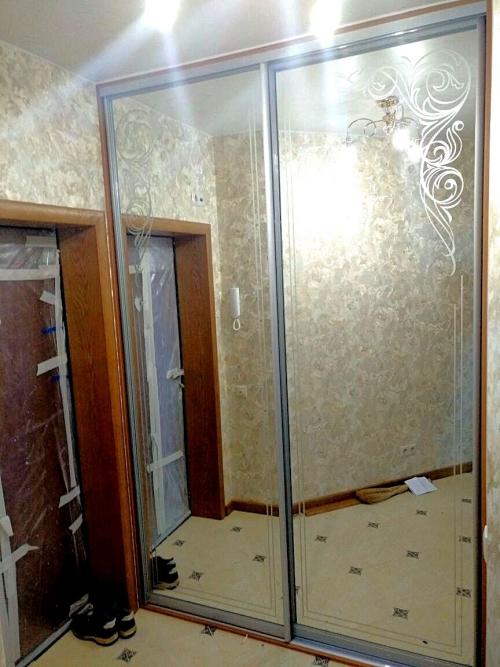 Красивый встроеный шкаф-купе с пескоструйным рисунком на зеркалах фасадов в прихожую новостройки. В шкафу предусмотрен набор штанг для длинной и короткой (детской) одежды.