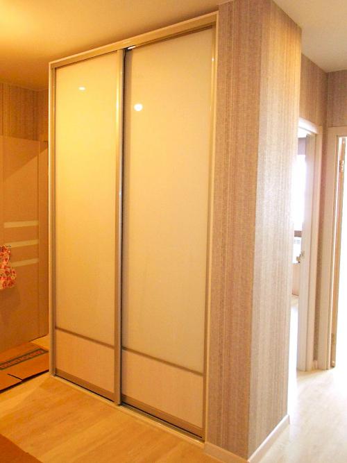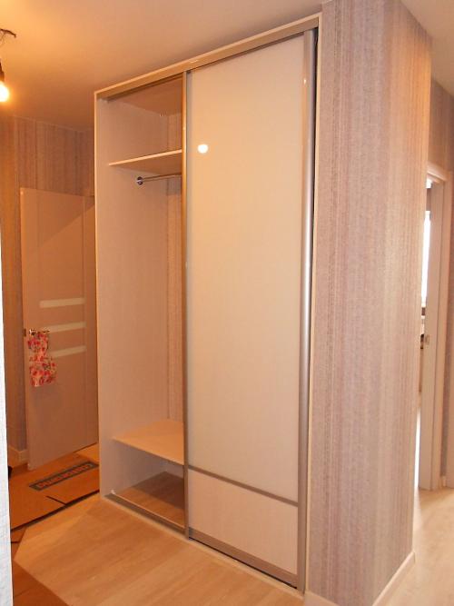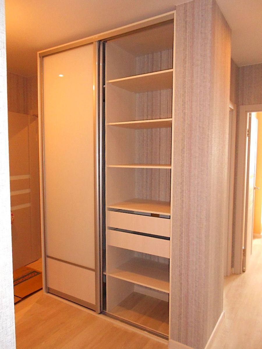 Симпатичный встроенный двух дверный шкаф- купе в прихожую. Удобное место для хранения одежды и вещей. В комплекте есть штанга, полки и выдвижные ящики. в фасадах крашеное стекло. В нижней части фасадов вставка из лдсп, которая поможет защитить стекла от случайного удара.