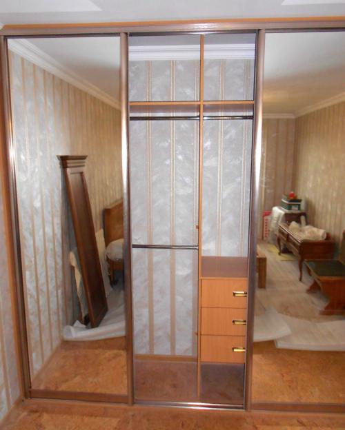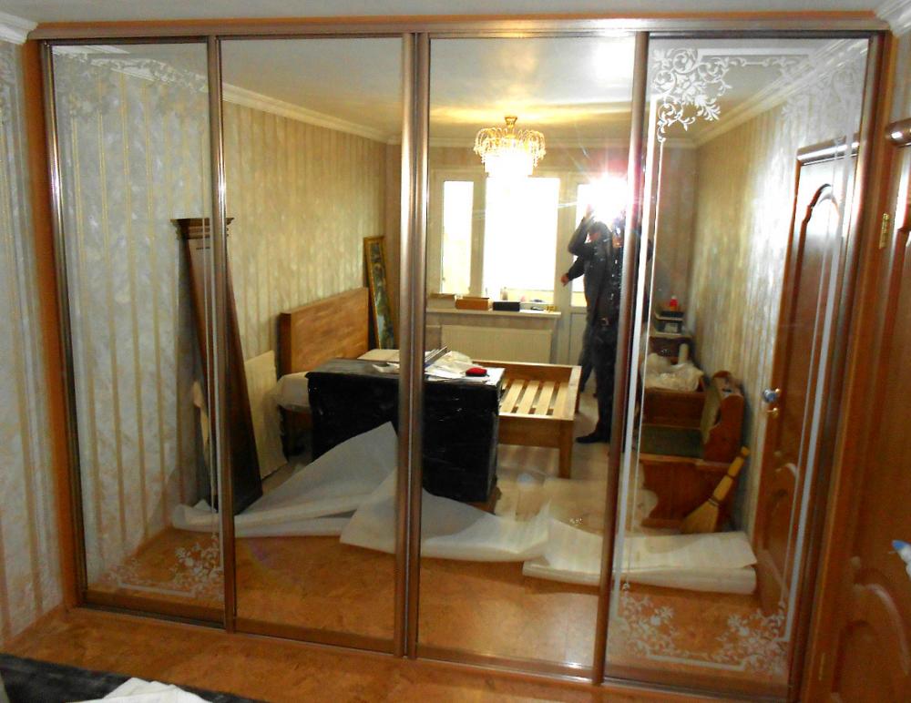 Фасады-купе: Алюминиевый профиль ШАМПАНЬ БРАШ, зеркало СЕРЕБРО, пескоструйный рисунок фон матовый.