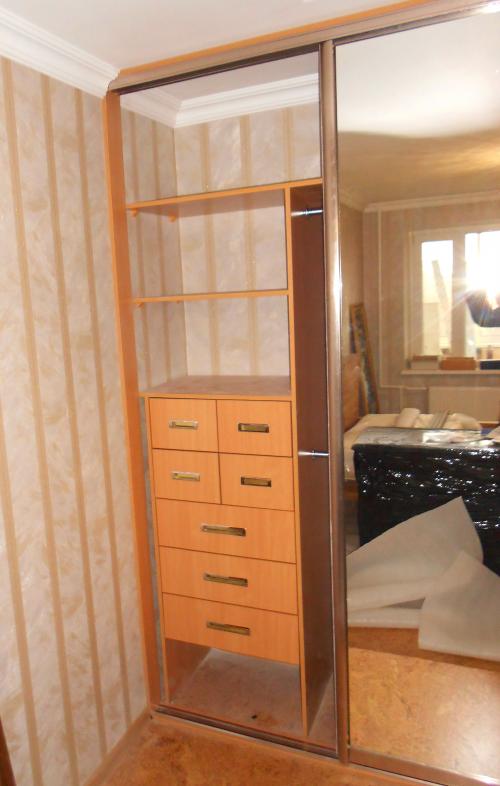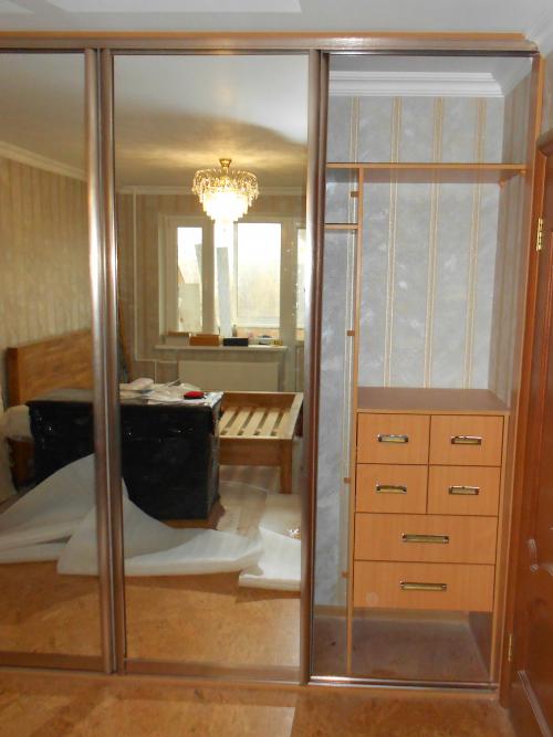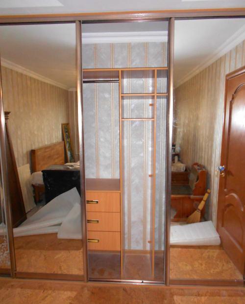 Огромный и вместительный шкаф- купе с 16- ю выдвижными ящиками, секциями со штангами для одежды, полками и специальными секциями для стремянки, гладильной доски и пылесоса. Этот шкаф позволит разгрузить остальные комнаты от громоздкой мебели и оставить в них больше пространства. На фасады- купе установлены доводчики.Ручки ящиков врезные. Механизм выдвижения шариковый (полного выдвижения).