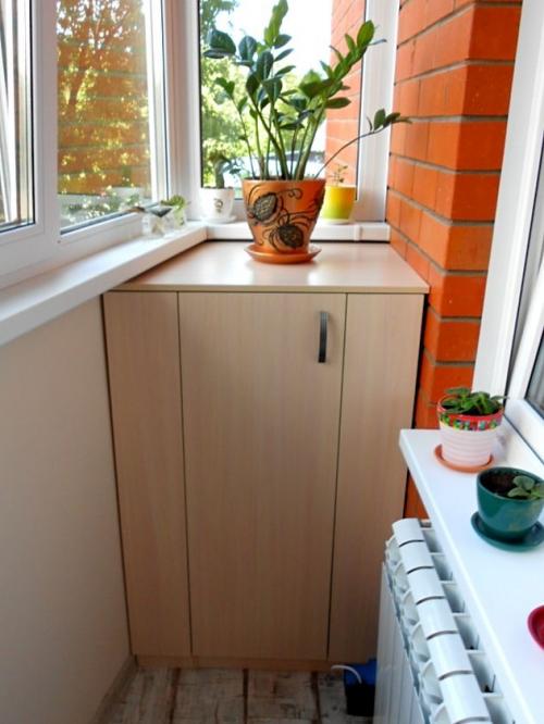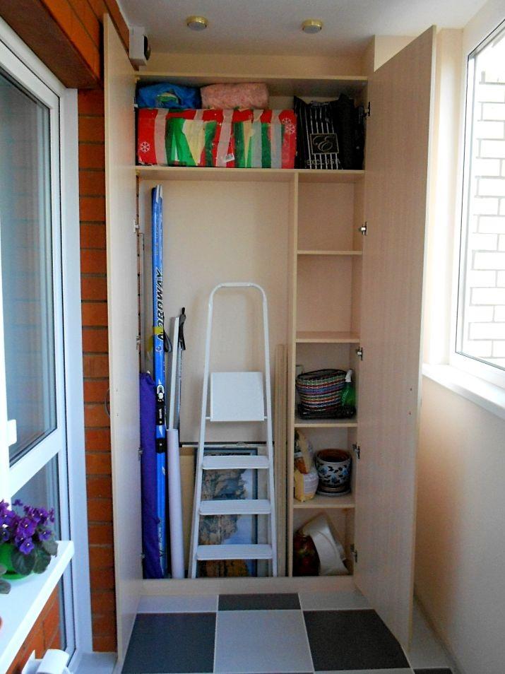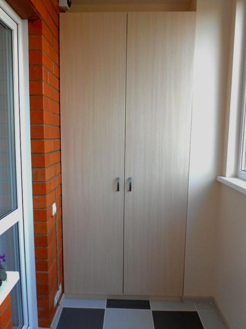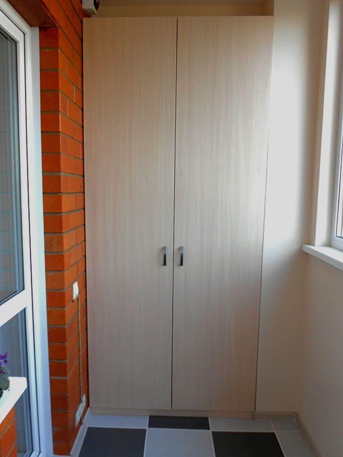 Встроенный распашной двух дверный шкаф на лоджию. Шкаф предназначен для хозяйственных нужд. Кроме него в комплект вошли две тумбы.