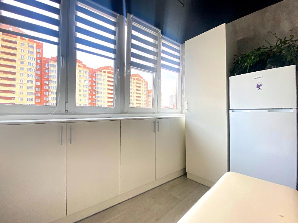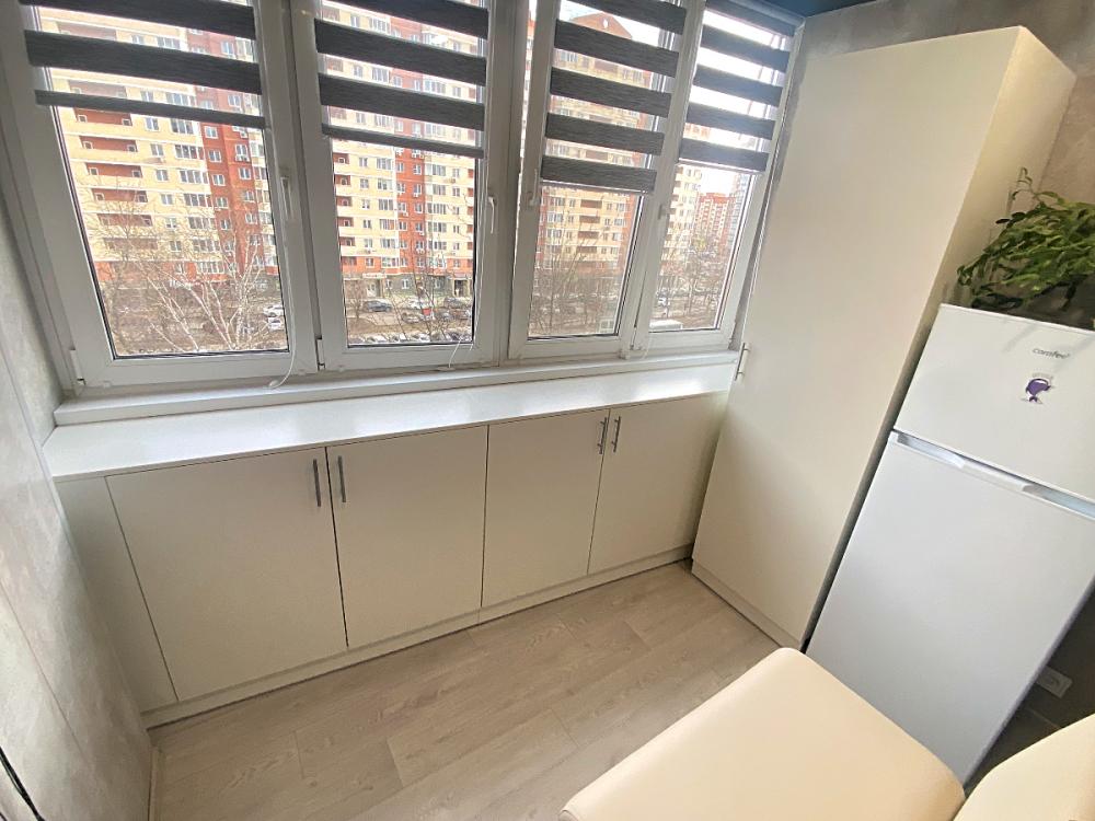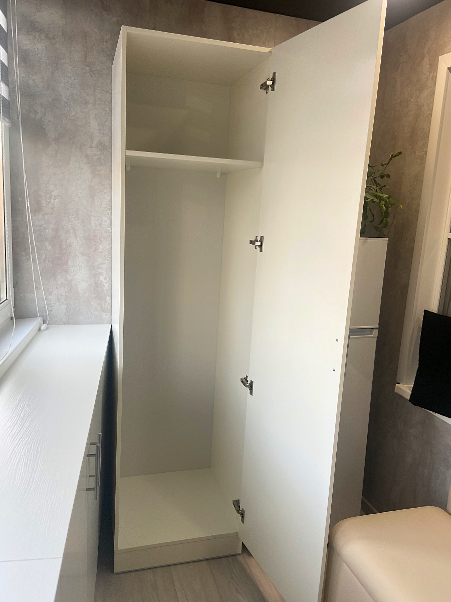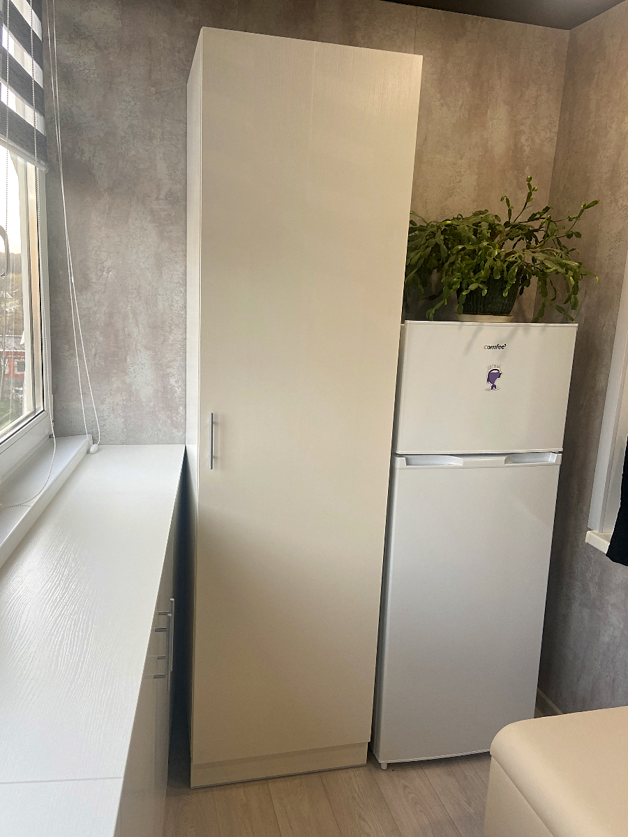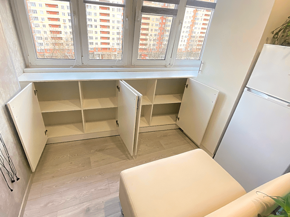 Комплект мебели с распашными фасадами на лоджию. Тумба под окно во всю ширину лоджии и шкаф для хозяйственных нужд. Такое размещение мебели оставляет достаточно пространства на лоджии и создает удобную систему хранения.