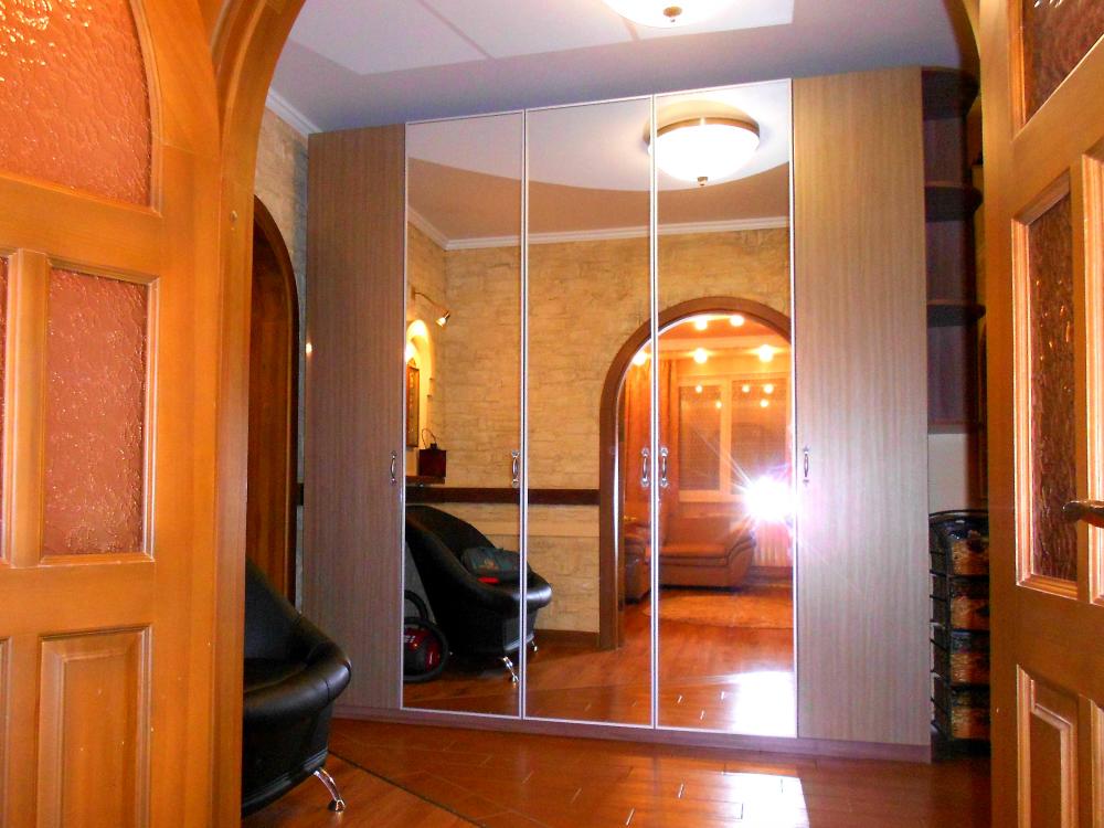 Шикарный большой распашной шкаф с тринадцатью выдвижными ящиками, множеством полок и штанги. Боковые фасады в пленке пвх глянец, а центральные- зеркала в алюминиевой рамке.