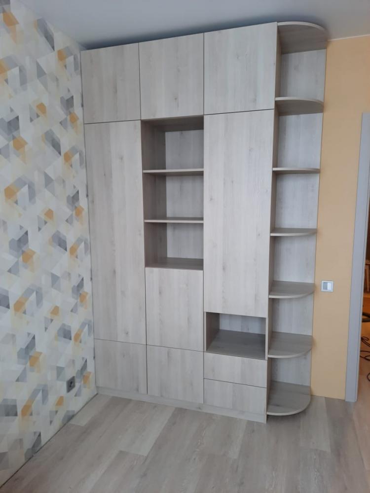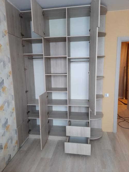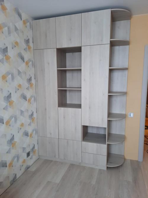 Симпатичный вместительный шкаф с распашными фасадами, открытыми нишами и колонкой с радиусными полочками справа. Есть штанги для одежды, полки и выдвижные ящики для белья. Открытые полки предназначены для книг. На радиусные полочки можно поставить красивую безделушку. Шкаф в спокойных тонах.