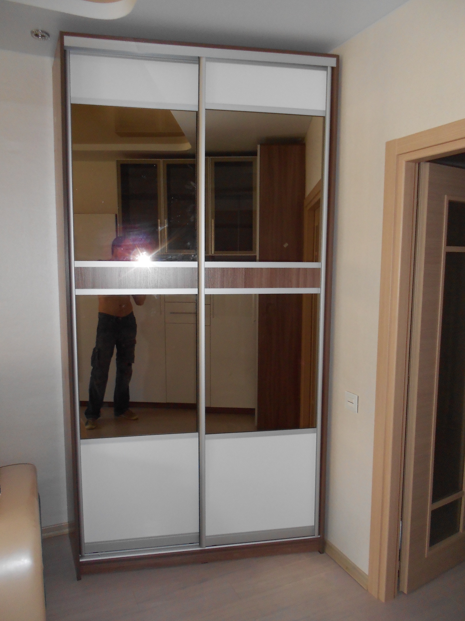 Фасады-купе: Алюминиевый профиль СЕРЕБРО с делителями, пленка ПВХ AGT супер глянец на МДФ, зеркало БРОНЗА.