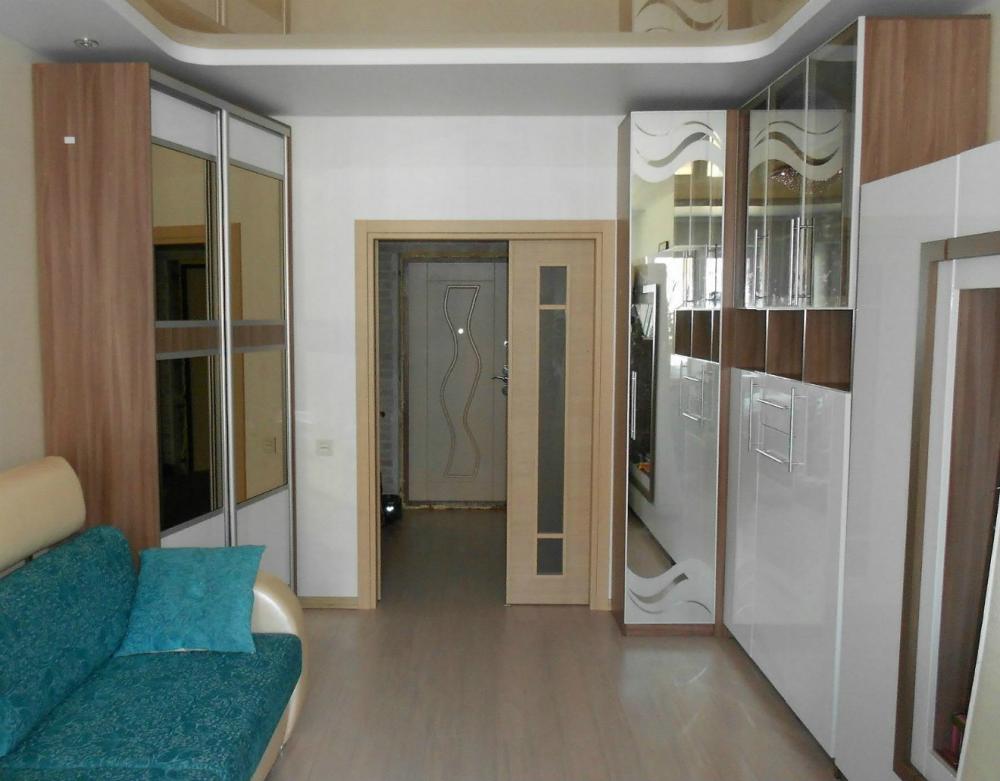 Красивый набор шкафов в гостиную. Слева- разнобокий шкаф- купе с двумя фасадами. Справа угловой набор распашных шкафов.