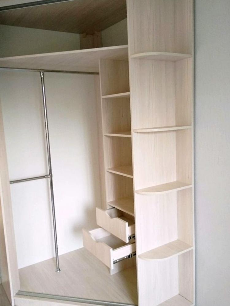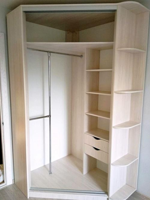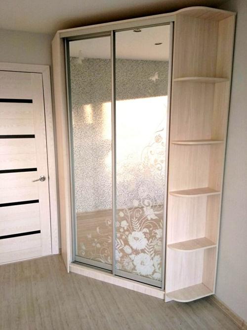 Большой угловой шкаф- купе в спальню с зеркальными фасадами. На зеркалах фасадов пескоструйный рисунок. Удобное место хранения белья и одежды. Штанги для длинного и короткого платья. В колонке с полками есть два выдвижных ящика. Большая глубокая антресоль. Справа на шкафу ряд открытых полочек.