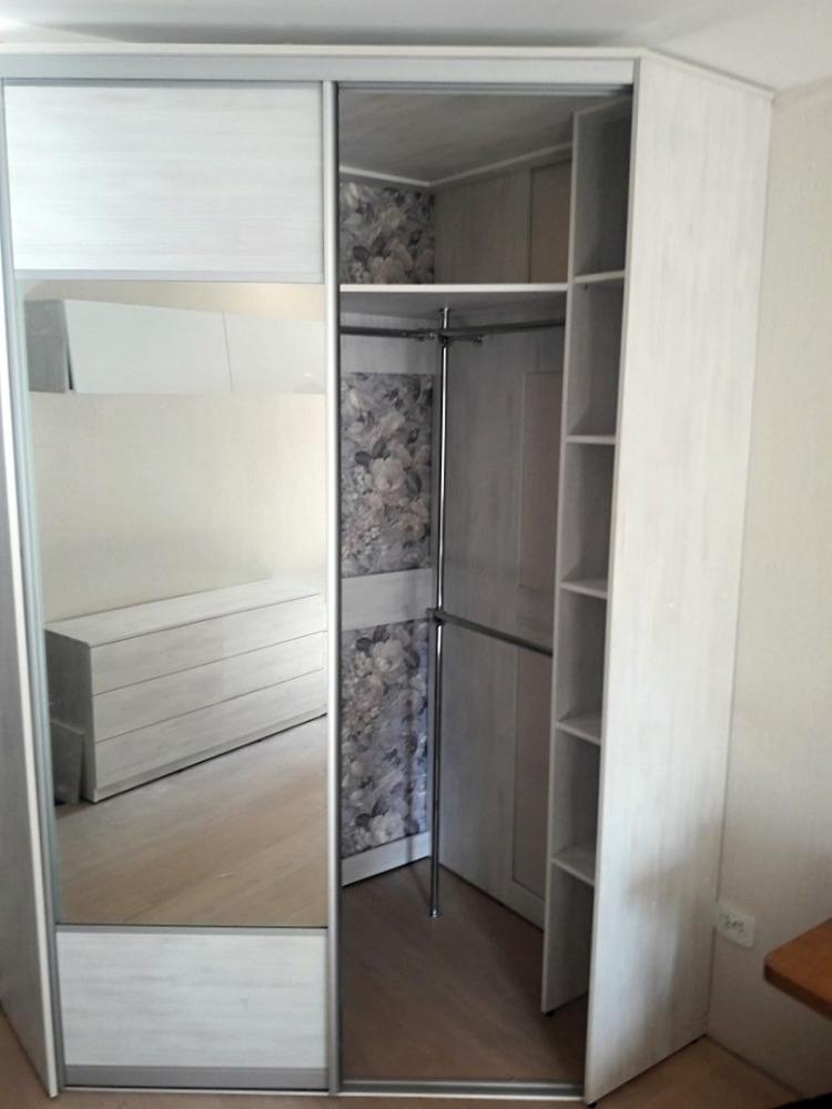 Большой угловой зеркальный шкаф- купе в гостиную комнату с глубокой антресолью, колонкой с полками и длинной штангой для одежды. Зеркальные фасады не только дают возможность одеться перед зеркалом, но и визуально растворяют большие габариты конструкции и устраняют давящий эффект.