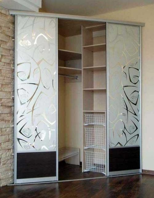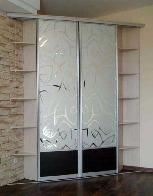 Фасады-купе: Алюминиевый профиль СЕРЕБРО, зеркало СЕРЕБРО, пескоструйный рисунок фон матовый.