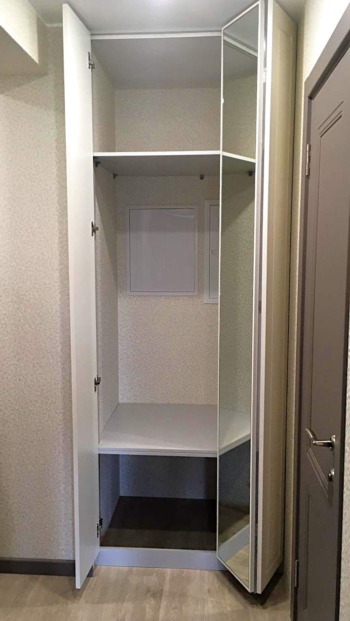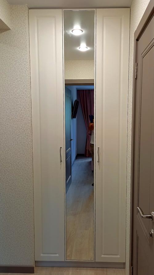 Интересный встроенный распашной шкаф в коридор. Три фасада в пленке пвх. Боковые с фрезеровкой. Центральный фасад с выборкой центральной части, глубиной 4 мм., и вклееным в нее зеркалом. Фасад слева распашной одинарный. Фасад центральный и правый являются единой складной конструкцией.