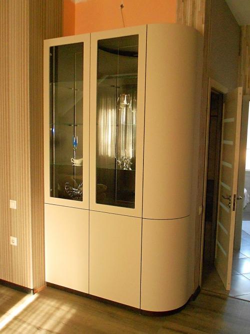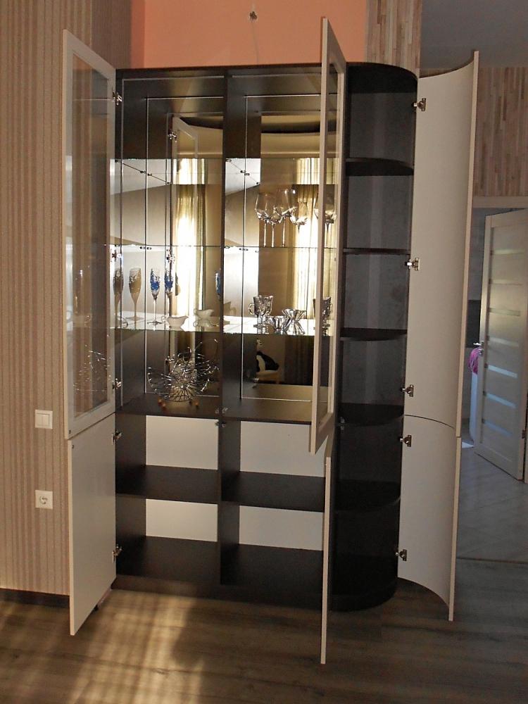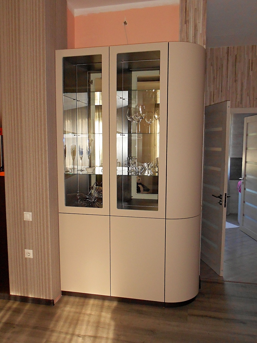 Симпатичный распашной шкаф- витрина в гостиную коттеджа. Фасады в пленке ПВХ супер мат. "Мыльная" поверхность пленки отлично моется. В зоне стеклянных фасадов полки из стекла и светодиодная подсветка. Открывание фасадов- толкатели Пуш.