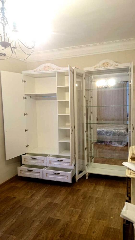 Шикарные классические шкафы в дворцовом стиле с золотой патиной на фрезеровке фасадов и декоративных элементах. Платяной шкаф с группой выдвижных ящиков снизу и шкаф- витрина для посуды со стеклом в фасадах и зеркалом по задней стенке. Шкафы стоят на резных ножках.